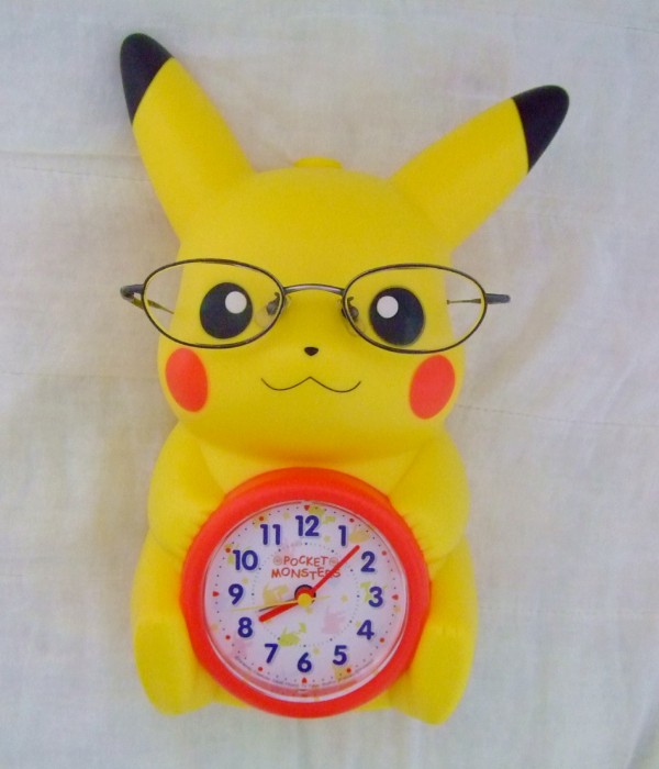 どっかの朝番組のコーナーじゃないけど、990円で買えた幸せ…! ピカチュウ目覚ましにメガネかけさせると、ちょっと知的に見えてしまうのは気のせい?(