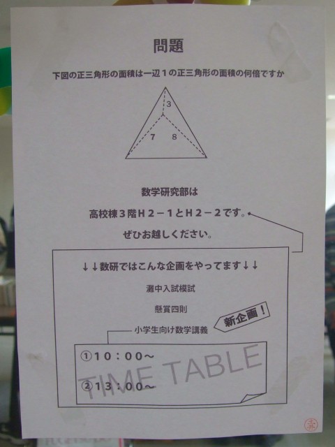 それと 広告用ポスターの問題は簡単ですねー 3,7,8の三角形と一辺1の正三角形の面積比が算数で出るのかは微妙ですが